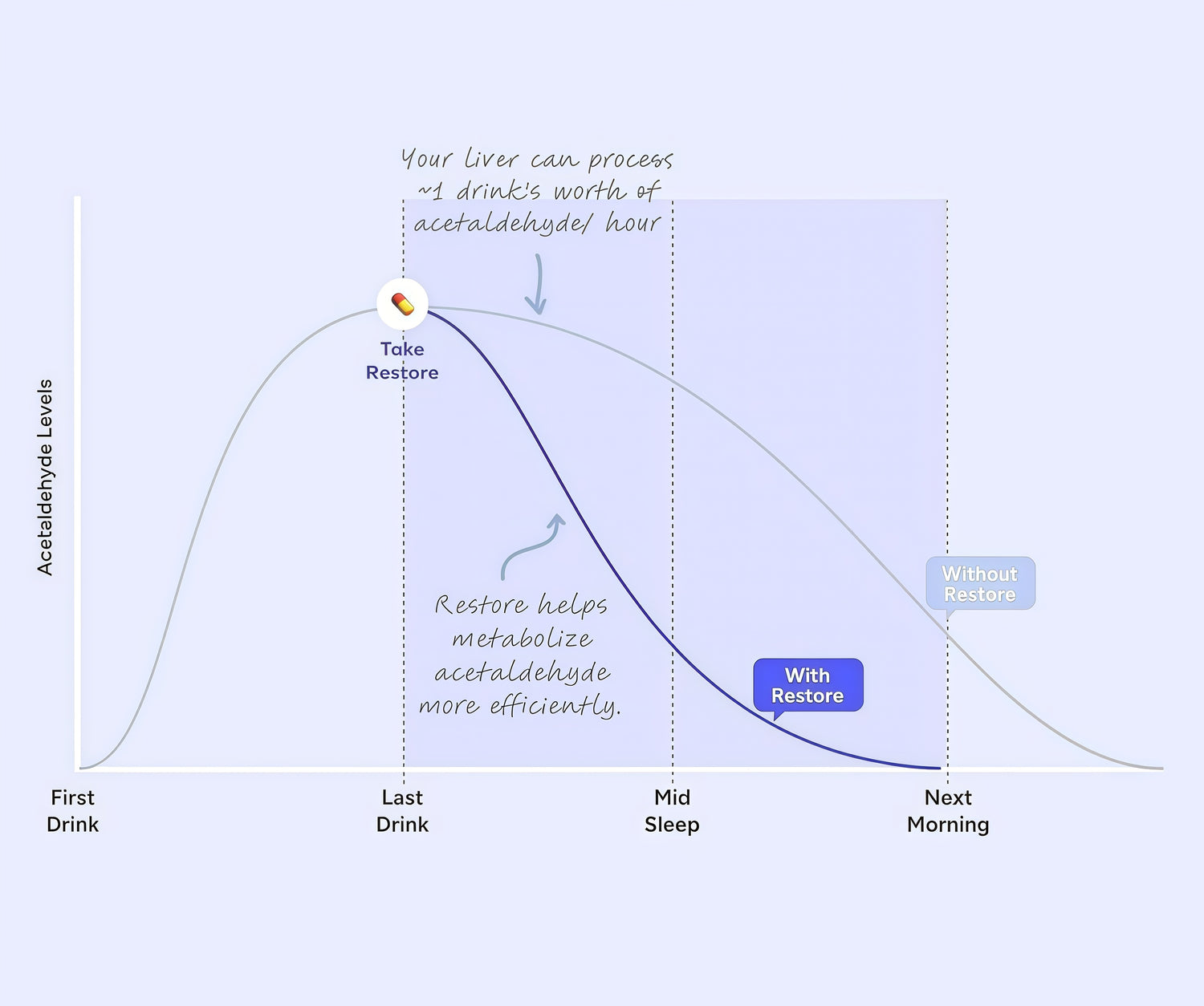 To metabolize alcohol, your body must first convertalcohol into acetaldehyde (20x more toxic thanalcohol itself) before clearing it from your system.Restore reduces the time you're exposed toacetaldehyde, helping to speed up themetabolization process.