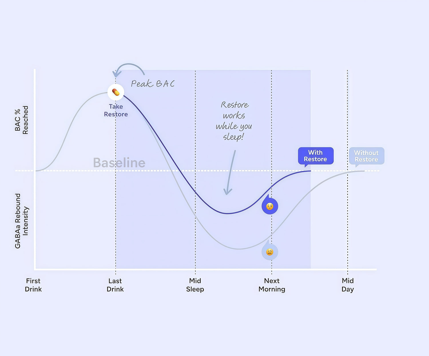 Alcohol binds to your brain's GABA receptors,making you feel relaxed. When you stop drinking,your GABA receptors go into withdrawal, causingyou to feel anxious & irritable. Restore works whileyou sleep to reduce the GABA rebound, andultimately your relative time & level of discomfort.